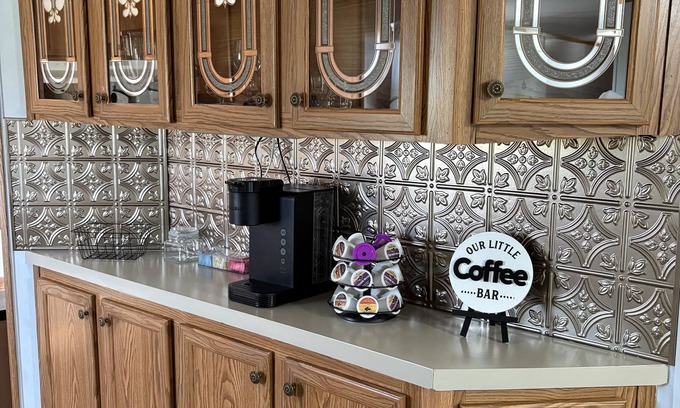 The kitchen is equipped to make you feel right at home, there is hot tea and coffee, a Keurig for 1 cup or a pot for the bunch. If you plan on cooking we have it all toaster, microwave, crock-pot, air fryer, blender along with plenty of pots and pans for your cooking needs. Having a little sweet-tooth and like to bake we have cupcakes and cake pans available as well.