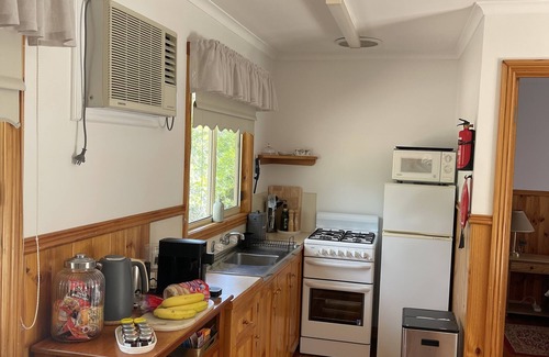 The kitchen consists of a free standing gas stove and oven combination and a small fridge, perfect for keeping your weekend goods cool. All crockery, cutlery and glassware is provided.