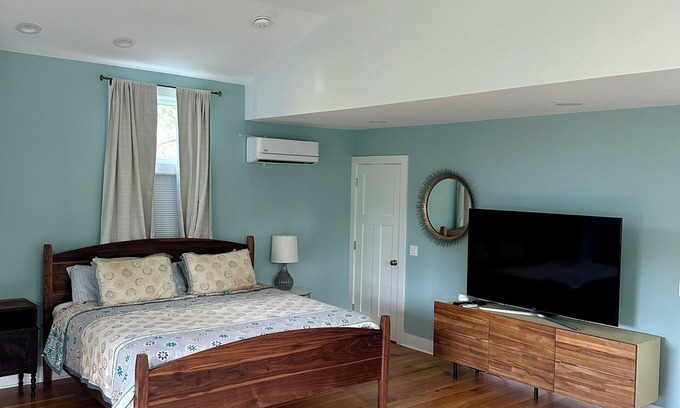 Nestled in the countryside near Rocky Hill, this brand new addition to our 1770 Farmhouse is 14 mins from downtown Princeton. The spacious 400 sq' studio features a full kitchen and bathroom, 65" tv with apple tv, hardwood floors throughout, and a handmade walnut king-sized bed. You have your own driveway with enough parking for 2-3 cars, your own entrance and dedicated laundry. Interaction with hosts in minimal as we have our own driveway and a separate entrance. We are 2 miles walk, run or drive from the Delaware and Raritan Canal towpath.