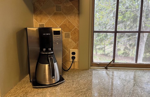 The home also features an outdoor shower. It is on the side of the house, not under the house. You can look out at the State Forest while showering. The huge copper rain shower head provides a downpour that is warming even on a cold day, and so inviting, take care to save hot water for the next person. The shower has a built in bench and easily fits two,