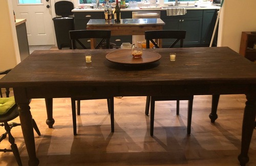 Relax and enjoy the privacy and serenity of this 1902 restored Farmhouse and Property! Explore your own private pond where you can canoe, swim, catch and cook your fish on the brick grill in the pic-nic area by the Pond, walk the trails thru the fields and woods and enjoy the bounty and beauty of the gardens for your stay! This property has many charming and unique features including a newly remodeled, fully appointed and well stocked kitchen, so if you like to cook and whip up meals and snacks for yourself and your crew, this kitchen is for you! (all new appliances, gas range, fridge and dishwasher, including oils, condiments, spices, most kinds of cookware and gadgets) There is an island stocked with silverware, bowls, wine glasses and a cocktail bar/server with ice bucket, shaker glass, bar tools, highball and shot glasses. The antique farmhouse table in the dining room can accommodate 8 or more people (there are extra chairs as well) and it all flows from the kitchen so you can be together and enjoy your mealtimes!