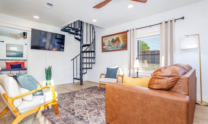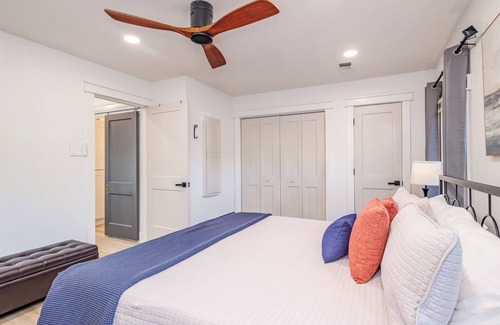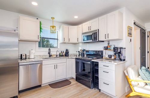 Downstairs, the master bedroom includes a comfortable king bed and is located next to a full bathroom with a walk-in shower. Upstairs, the loft area provides additional sleeping space with two twin beds and a futon, making it perfect for kids or extra guests. Whether you’re traveling as a couple, a small group, or a family, this guesthouse has flexible space to suit your needs.
