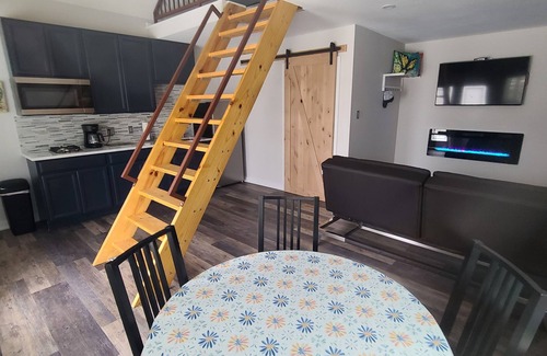 Located on our 4.26acre homestead. The loft sleeping area has 2 queen beds. Fully equipped kitchen with fridge/freezer, microwave and a 2burner cooktop make meal preparations a breeze or bring your favorite meal to grill in the outdoor kitchen area. equipped with a SS grill, sink, and ice maker. Beautiful oversized walk-in shower in the bathroom, and a quaint living area for relaxing or work from the sofa at the pop-up coffee table. The sofa lays down into a comfortable bed if you don't want to climb the stairs after a long day of "relaxing".