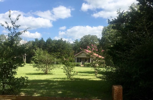 This is a 900 Sq. Ft. Dog friendly house with high ceilings, two bedrooms one bath inside (2nd bathroom with shower in garage) with central AC and heat. Our house is on eight acres of unfenced property with large trees, open fields and a pond. We have an area behind the house that we have fenced in for our fur babies or yours. (Extra fee 50.00 per pup)for your pups) we do have a TV with basic Satellite service and no Internet. We have not had a problem with accessing.