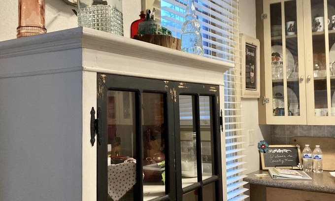 Our house was built in the 1940s in an area of Houston called “The Heights”. It was moved up to this eight acres of land in Caldwell in the early 2000’s and has remained in its original form with a few comforts added. Everything from the beautiful cherry wood trim, and doors to the squeaky wooden floors is original.