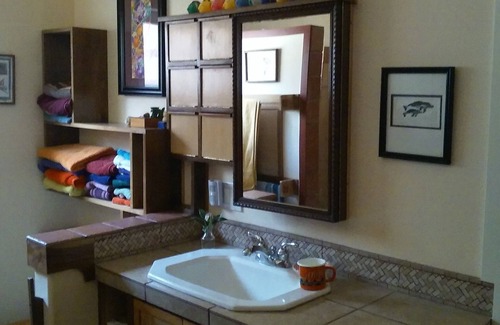 This 2000 sq.ft. 8 year old custom built home is internationally flavored and has a large easy-working and fully-appointed kitchen. There are three large bedrooms (2 upstairs, one down) with comfortable beds. Covered porches front and back. Large southern exposure courtyard with lots of flowers. Paved drive and parking