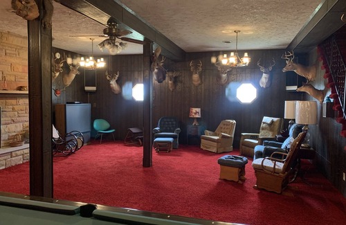 Travel back in time with the 1970’s décor while experiencing the serenity of country life. This spacious and homey farmhouse with 10 beds sleeps 17 plus! Bring some air mattresses to toss into the expansive hunter’s haven great room for additional sleeping. Your kiddos will enjoy the two sets of bunk beds and the adults will enjoy the five full baths! Feed your hungry mouths in this spacious farmhouse with it’s fully stocked kitchen complete with kitchenware, stove, microwave, dishwasher, frig, kitchen table plus a formal dining room table for the larger crowd to eat together. Grocery and related stores are just a 10 mile jaunt down the road. End your evening by the fire, enjoying the beautiful sunset or the starry sky. Escape the bustle of normal life and book your vacation today!