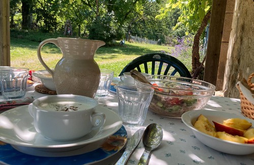 Enjoy your private covered terrace overlooking a peaceful courtyard, where an old bread oven faces you and provides fresh sourdough bread. The shared garden surrounds you with Limousin meadows and woods, ideal for cattle breeding.