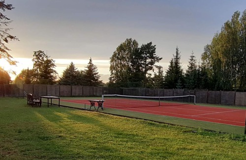 Our holiday home stands on an approx. 6,100m², fantastic lake ground with its own tennis court and its own bridge; The bank is about 50m long. Generous lying and meadow areas offer enough space for a wide range of relaxation; Ideal also for families with children. Pets can also be brought along. Animal owners have to make sure that the other guests are not disturbed. The house offers Seeblick and is divided into a living room with a living room with satellite TV, a bathroom with shower and toilet, 3 bedrooms (2 double beds and 2 single beds) if necessary. Fully equipped kitchen open to the living room. A freezer is located in the storage room for bicycles/ water sports equipment + can be used at the same time with the guests of the small apartment.