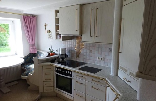 You can expect newly furnished rooms in our 300 year old country house. You spend your holiday ALONE in the house. If you want to experience tradition with modernity, you have come to the right place! On 85 m² you can enjoy your holidays in 2 double bedrooms, which are located upstairs. On the ground floor there is a newly decorated bathroom, a cozy living room with tiled stove and TV and a kitchen with wood stove, dishwasher and all related equipment. In addition, there is a room on the ground floor with washer and dryer, 2 toilets and a storage room for your skis, bicycles etc. On 500 m² garden with herb garden you can let your mind wander. If required, you can book a single room (10 m²).