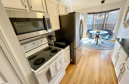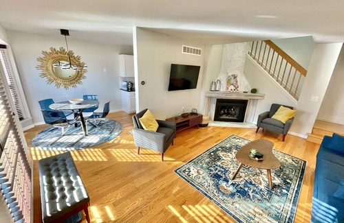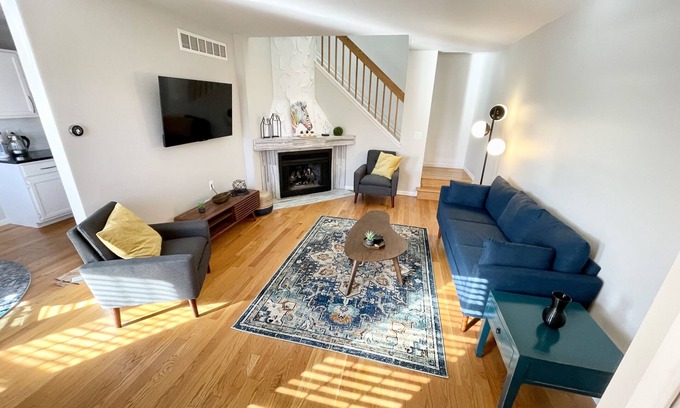 Cozy Mid century modern Decor with hardwood floors, granite counters large Master suite. High Ceilings with skylights. Finished Basement with day bed smart tv, work space and laundry room. Fully functional and stocked kitchen. Gas fireplace. Gated patio for outdoor privacy. Community Outdoor Pool and Tennis courts. Located in a quiet serene neighborhood that is super close to grocery stores, restaurants, bars and much more. 3rd sleeping area is in the finished lower level.