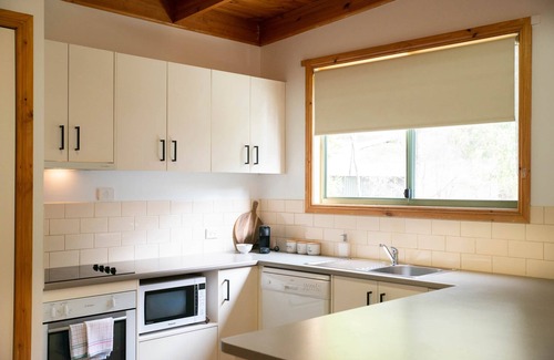 The open-plan living area welcomes you with cathedral ceilings, plush furniture, and a wood heater, creating a cozy ambiance in Winter and a split system Air conditioner for those hotter months. Entertainment is at your fingertips with a smart TV. A well-equipped kitchen with modern appliances, a compact laundry with a washer and dryer, and complimentary coffee and tea upon arrival ensure that every convenience is at your fingertips.