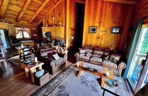 This Country Log Cabin is situated on 3 acres on a quiet country road. Walk-in to the kitchen which is open to the living room with a wood burning fieldstone fireplace, which has a comfy nature-themed couch and chair. It also has an antique rocker. As you walk down the hall the master bedroom - The Moose Room - is directly in front of you. The decor and king size bed welcome you. The master bath is complete with a corner style shower. The second bedroom to your left - The Bear Room - which has an authentic queen size log bed and bear decor. Just outside there is a half bathroom with a washer and dryer. Please read “Other details to note” for more important information.