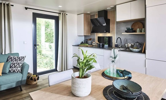 Accommodation: The king of 3 bedrooms and 2 bathrooms is chic and modern. Its originality is present inside with high-end equipment. MAXIMUM 6 PERSONS . CAUTION OF 300 EUROS IN CB ONLY. Dog not allowed.THE INFRASTRUCTURES OF OUR CAMPING ARE ACCESSIBLE ONLY FROM 15H, TIME OF THE CHECK-IN, AND UP TO 10H, TIME OF THE CHECK-OUT DAY.Location assignment is done randomly and is definitive. It is therefore not possible to change the mobile home number according to your specific preferences or requests.Non-contractual photos