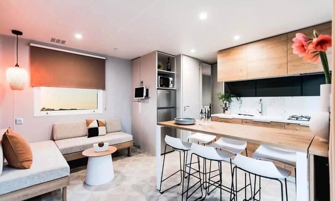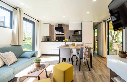 Accommodation: The STAR 3ch is our 3 bedroom ultra-light comfort model. It benefits from a enfilade kitchen with direct access to the terrace. You will enjoy its high table for lunch or prepare meals in all conviviality. The TV is located in the UNQIUEMENT lounge. MAXIMUM 6 PEOPLE. CB CAUTION OF 200 EUROS Coffee maker gold in mobile home.THE INFRASTRUCTURES OF OUR CAMPING ARE ACCESSIBLE ONLY FROM 15H, TIME OF THE CHECK-IN, AND UP TO 10H, TIME OF THE CHECK-OUT DAY.Location assignment is done randomly and is definitive. It is therefore not possible to change the mobile home number according to your specific preferences or requests.Non-contractual photos