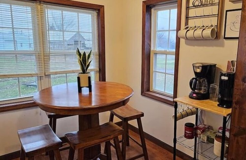 This cozy home is on one level and offers warm comforts for guests. We strive to be family-friendly with offerings such as toys, board games and a small swing set outside. There is a rocking chair in the main bedroom. There are TV's in each room with streaming services in two of the rooms. There is a kitchen nook with four stools and a dining room that seats four as well.