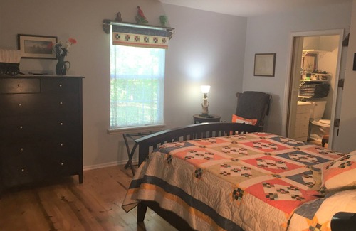One bedroom, one bath, kitchenette, refrigerator, microwave, stove. Queen bed with SertaRest gel memory foam mattress topper. Queen hide a bed. Linens provided. Basic cookware, utensils and dish ware. Central h/a.