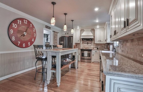Downstairs features a large dining room with an extra long table that seats 12. Perfect family meals and activities, curl up on the living room couch with a book by the wood burning stove, enjoy the large country style fully stocked kitchen