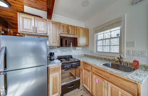 This countryside home is the perfect getaway for those who love camping but enjoy the finer things in life. The all-wood interior brings authenticity to the forest location with comfortable indoor and outdoor furniture to capture the peaceful mood. A large TV with streaming services sits above an updated fireplace, and the kitchen is well-equipped for prepping your favorite recipes (no dishwasher). Enjoy your meals at the large dining table, or step out to the deck for casual meals on the comfortable lounge furniture. The rustic yet modern feel can be seen throughout the home, with gorgeous updates like a basin sink and spacious shower. Kids will love the unique space in the loft with the apex of the vaulted ceiling.