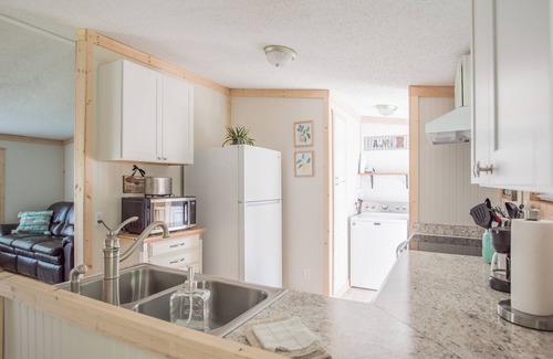 Our place is a small manufactured home that has been totally renovated inside and out and updated to a fresh new place for couples or families traveling to the area. (900 square feet)