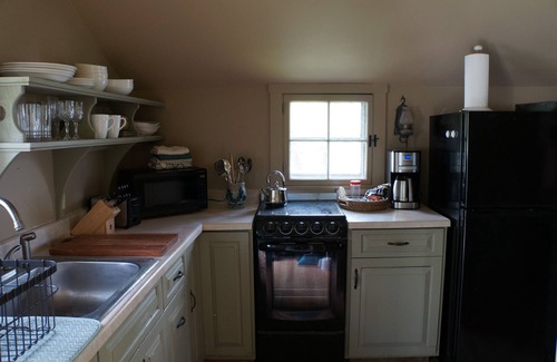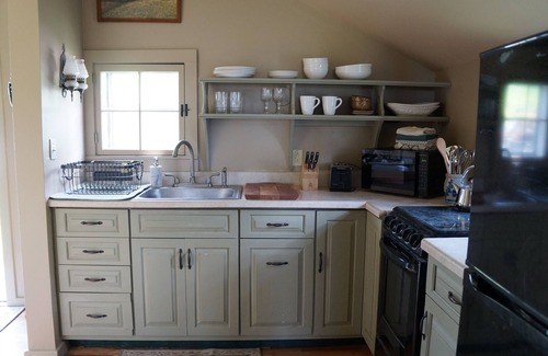 The cottage includes a queen bed, a full bathroom, a full kitchen stocked with pots, pans, plates, bowls, glasses and utensils, a small dining area that seats 2, a living space with a full sofa, arm chair, gas fireplace, and a Roku TV with guest mode where you can easily and temporarily sign-in to all of your personal streaming services. There is a designated work space with a desk and chair. If you have a small child we do have a pack and play available in the closet at all times. Enjoy a mountain view from the deck and feel free to enjoy the back yard.