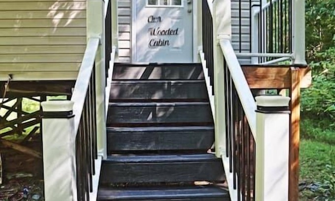 Our Private Wood Cabin is nestled in the woods with its own private driveway and creek. It has all of the modern amenities and luxuries of modern day living and is nice and cozy for up to 5 people. There is one private bedroom, and a loft bedroom both with queen beds, as well an oversized sectional couch with a chaise. All of the furnishings inside of the cabin are new and comfortable.