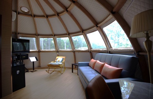 Luxury Domes: Enjoy spacious and comfortable domes equipped with modern amenities, including free high-speed fiber optic Wi-Fi, fully equipped bathrooms, and a 65-inch TV with 4K Netflix and Roku. Each dome features a king-size bed in the bedroom and a king-size sofa bed in the living room. Large windows provide beautiful views and natural light, while the interior combines rustic charm with modern comfort, creating a cozy and inviting space. Each dome is also equipped with HVAC, ensuring you stay comfortable in any season.