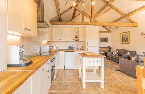 The large open plan Kitchen Dining Room affords lovely views over the farm and offers all you require for a self -catering break including an electric induction hob, electric oven, dishwasher, large fridge freezer, cookware and Nespresso Coffee Machine. The dining area has a table and chairs for six.