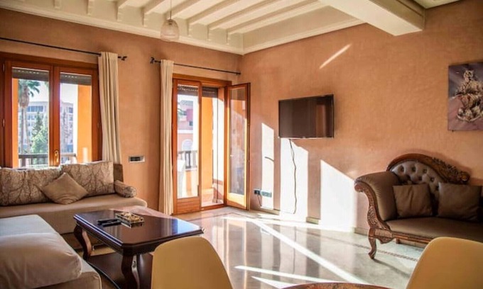 Enjoy a Luxury Home made to your desires in The heart of Marrakech, with a queen bed, a fully equipped kitchen for those who enjoy cooking together during travels. An amazing Living Room to spend your evening in after a long day of exploring Marrakech secrets. The house has amazing natural light all day long and is equipped with sound proof windows to calm the mind and soul.