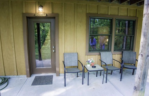 (VERY IMPORTANT: This is a lovely efficiency apartment. You will NOT have the entire home to yourself! If this is fine with you, read on....) "Quiet" has a large bedroom with a Queen bed and a private bathroom on the lower level of the owner's newly built log home. The apartment has a kitchenette and small dining area and includes a light Continental Breakfast with the nightly rate. The breakfast is left in the mini-fridge and on the counter for your self-service. If you require a more robust breakfast, please consider bringing some of your own foods to be heated in the microwave. WiFi is available. There is outdoor seating, a chiminea, a grill, and a (shared) hot tub for guests' use. This accommodation is nestled on the border of Yellowwood State Forest with 40 acres of wooded property to explore and lots of nearby hiking trails. "Quiet" is situated halfway between Bloomington/IU and the artist village of Nashville. (Ask about booking both “Peace” and “Quiet” apartments together for larger groups.)