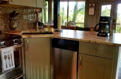Completely remodeled with open-beams, wood ceilings and floors, along with floor to ceiling windows this cottage immerses you into nature among the trees. Fully equipped modern kitchen including everything to prepare meals. Complimentary coffee/creamer/sugar. King size bed with plush mattress and layered bedding for your comfort. Cabin is equipped with propane gas logs (October - March) a Smart flatscreen TV and high-speed internet (cable is not available). Outdoors enjoy nature while on the decks which include a bistro table for outdoor dining, propane grill, two lounge chairs and a hot tub!