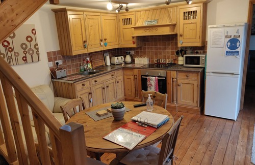 The heart of the cottage is its cozy open-plan kitchen, dining, and lounge area, exuding warmth and character: