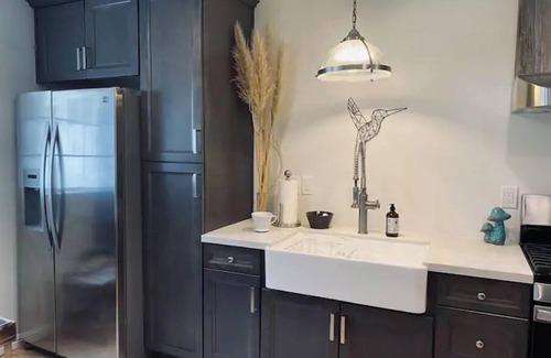 The courtyard cottage offers guests premium sheets and pillows for a comfortable night along with a shower gel, shampoo, and conditioner. There is a full size refrigerator/freezer, BBQ grill, toaster oven, stove and oven and blender. It is also stocked with quick snacks, and coffee pods. An iron, pour over coffee, Keurig coffee maker, and a TV with a Roku are provided.