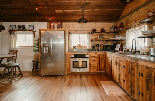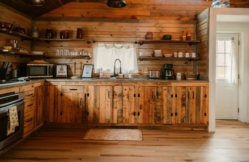 The cabin itself is a work of art, handcrafted with attention to detail. The ceilings feature milled walnut from northern Indiana, while the pallet wood used throughout the cabin is untreated and sourced from Kentucky. Custom-built cabinets, shelves, and a stair rail made from trees on the property add to the rustic charm.