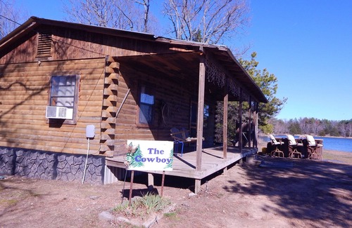 Built in the 90's out of logs, the Cowboy Cabin has a rustic, vintage feel. Over the years, the floor has settled and become a bit unlevel, but is sturdy and strong. The cabin is decorated reminiscent of the Old West. Thereis a private bedroom with a queen bed. The living area features a double bed in the living area and 2 chairs that make into individual beds, a Roku smart TV, videos, games and free internet. The bath has a shower and sink with mirror. The full kitchen has a dining table with chairs, cookware, dishes, a Keurigand regular coffee maker. Enjoygreat views from the large front porch, complete with a porch swing. The firepit with a bench and a small beach is right out the front door, as well as an outdoor kitchen with charcoal cooking and 4 chairs. Charcoal is not provided. Activities include fishing, boating, kayaking, hiking, biking, paddle boating, swimming, and walking on the path around the lake & more.