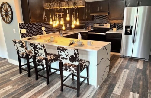 The Cowboy Couture unit is extra special with tons of western touches done in a modern way, with nordic storm quartz countertops, black hexagon tile backsplash and a gorgeous built-in marble 72″ fireplace and 65″ TV.