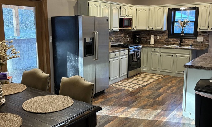 This farmhouse is located on 200 acres that sits right along the Piney River. The home sits on a working long horn cattle ranch. This delightful property offers a cozy and inviting atmosphere that will make guests feel instantly at ease. With 2 bedrooms, including a king bed, queen bed, and twin bed, there's plenty of space for everyone to relax and unwind. Our outdoor amenities include a fire pit and outdoor dining area.