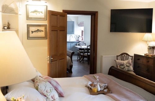 Amenities: Underfloor heating to wet room. Microwave, fridge, toaster, kettle, coffee machine, hair dryer. Smart TV, WiFi. Fuel and power inc. in rent. Bed linen and towels inc. in rent. White Company toiletries. Off-road parking available. Communal lawn area with furniture and barbecue, bike storage. Sorry, no pets and no smoking. Shop 1.8 miles, pub 0.5 miles, River Test 0.2 miles. Note: There is no oven or hob in the property. Note: This is an adult only property, unless the booking is for a wedding; in this case, child facilities can be requested. Note: This is an interconnecting room with Ref. 1119044 please request this upon booking. Note: There is a communal freezer for ice. Note: The wet room is fully accessible, suitable for those with limited mobility. Note: Continental breakfast hampers and baskets can be pre-arranged at a fee. Note: Guests have access to on-site fishing, which must be pre-booked. Note: There is an on-site teamroom, open April to September, offering 20% discount for all guests. Note: Free access to the garden from 11-5pm throughout the year. Note: Free access to the walled garden in the evening. Note: Early morning riverside walk. Note: Close proximity to local pub, The Boot.
