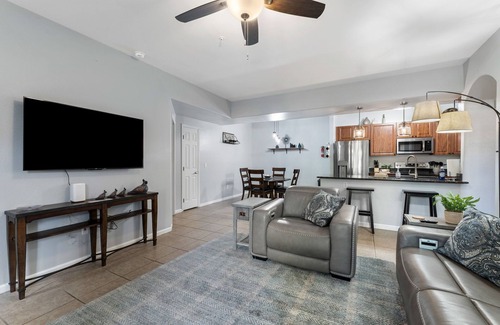 The condo's open-concept layout connects the kitchen, dining, and living areas, creating a seamless flow that’s perfect for both relaxation and socializing. The living room features comfortable reclining sofas in a soothing neutral palette, making it a great spot to unwind with a movie or enjoy conversations.
