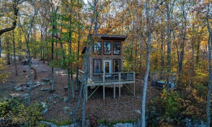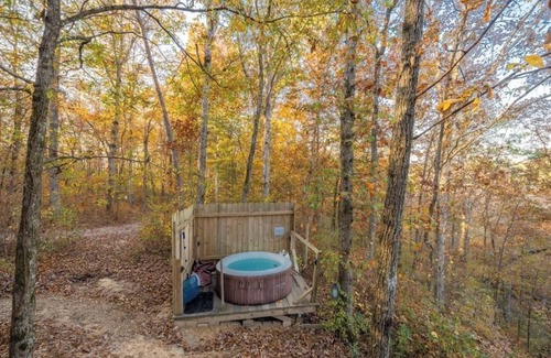 Beautiful retreat cabin for couples. Pics do not do this place justice. 224 sq ft. Has a full size bed downstairs and a queen size memory foam mattress in loft. There is a trail that leads to creek. There is a private beach area by the creek. There is no full kitchen but we have an outdoor grill. There is a microwave and kureig inside cabin. The cabin is pretty secluded for privacy and quietness. It sits at the dead end of the road. I live about 400 ft from the cabin. There is a large fire pit for you to use. The hot tub sits near the edge of the bluff and has amazing view of the creek. Feel free to gather up wood on the property to use for the fire pit. The bathroom consist of a shower, toilet and sink. There is an outdoor shower as well.