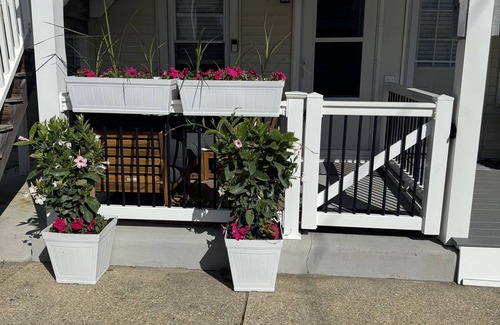 In the front of the house is an extremely cozy porch with brand new outdoor sectional and rug, folding drink tables, and the seclusion of custom railings topped with flower-filled planters.