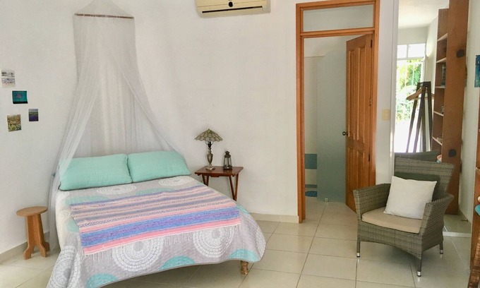 Beautiful, spacious and bright studio with full bathroom and independent entrance. Located a few blocks from the sea in the nicest area of Cozumel, a block from a lovely park, beautiful church and amenities and restaurants around. Very well equipped with all the necessary to have an excellent stay. It has a double bed, with a comfortable chair, hanger for suits and shirts, a table to work or eat, mini fridge, coffee maker, kettle, toaster, blender (smoothie maker) it includes coffee, milk and sugar. Iron, beach towels and bath towels, hair dryer and body lotion and showe gel.