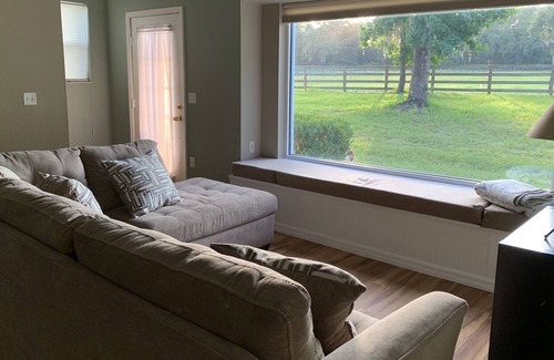 The cottage is located in North DeLand, close to DeLeon Springs, but also convenient to downtown DeLand and Stetson University. The cottage is tastefully decorated, with new appliances, flooring, cabinets, fixtures, lighting, bathrooms, the large rooms offer plenty of space, the one bedroom has a king size bed, the bathroom is handicap accessible, and space includes a stacked washer and dryer. The cottage sits on a very pleasant and peaceful 7.5 acre lot, this is in a rural area of DeLand so expect dirt roads and a country feel. There is a main home also on the acreage, but spaced a good distance from the cottage; so, privacy is available. Onsite is a small working farm, a few farm animals (4 pigs, 2 goats, chickens, and few horses) so beware they do make noise. We often see deer and wild turkey pass through in the morning and evenings. This is a great place to relax while visiting the DeLand area. Also close to New Smyrna beach (25min), Daytona beach (35 min) and Orlando (1 hour).