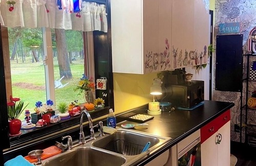 The kitchen is a retro 50's themed experience and includes the original metal cupboards with all new appliances (fridge, electric stove, dishwasher, Keurig coffee maker, etc). The bathroom is decorated in an outhouse/outdoor theme with its own outhouse structure (with running water of course).