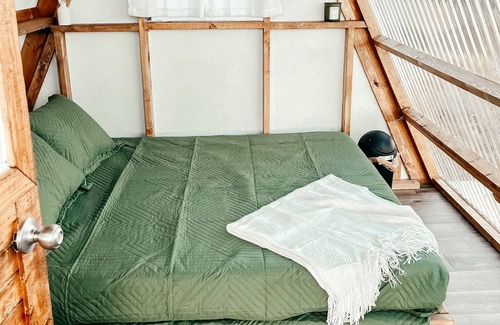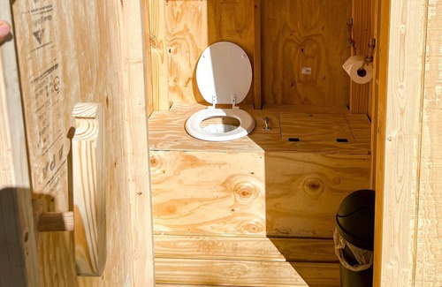 Experience the outdoors without giving up the comforts from home! Our A-Frame hideaway has a queen-sized bed, linens, loft with a small additional sleeping area, sleeping bag, deck, cooking area, outhouse which contains a dry composting toilet along with an outdoor shower that has a 5-gallon refillable solar heated water bag , fire pit, outdoor chairs, and a beautiful mountain view! Our glamping utilizes solar energy for eco-friendly camping providing interior lighting, and 4 USB ports for phone charging, bluetooth speaker usage, etc.