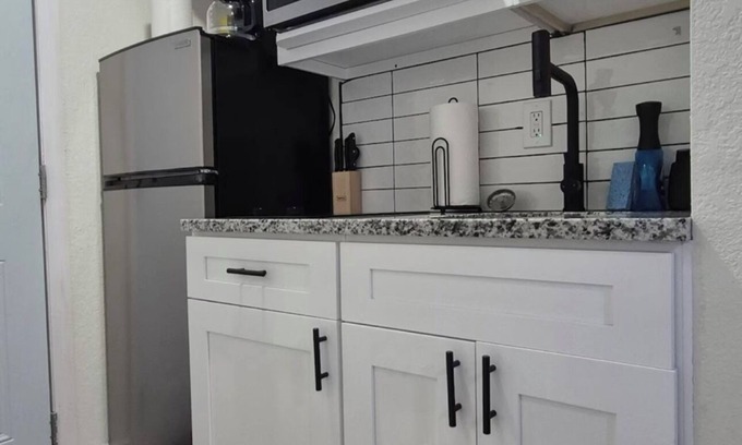 This clean and functional space includes everything you need for a short or extended stay: a cozy queen bed, bathroom, Wi-Fi, smart TV, and a basic kitchen setup with essential cookware.