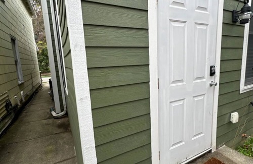 There is a small alley/sidewalk that leads from the street to the back of the home where the apartment is located. The door has an electronic lock with a code you will receive upon checking in.