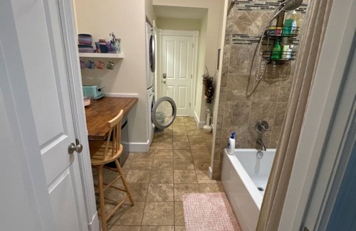 This apartment is part of a historical home built in 1891. The apartment has one full bathroom suite that also includes a kitchenette. The bedroom features a king size bed, as well as a futon. The bathroom features a tub/shower, sink, water closet, and washer & dryer units.