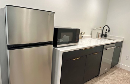 Enjoy the comforts of home with an in-unit washer/dryer and a kitchenette featuring a fridge, dishwasher, electric cooktop, and 3-in-1 microwave/air fryer/convection oven.