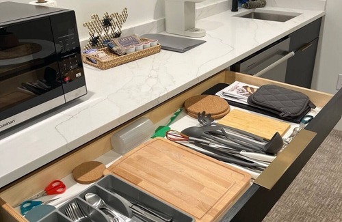 The kitchenette is stocked with everything you need—cookware, flatware, a Keurig for your morning coffee, plus some snacks on the counter to keep you fueled. There’s even a Brita in the fridge for fresh, cold water whenever you need it.